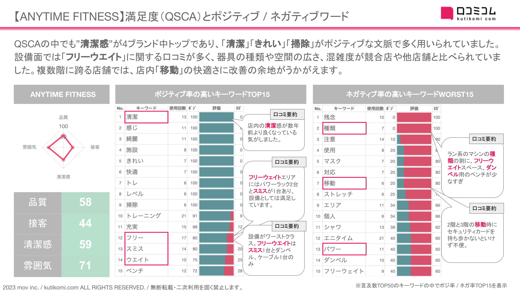 今回は、このAI解析を用いて【ANYTIME FITNESS】のQSCA・ポジ / ネガキーワードを確認しました。