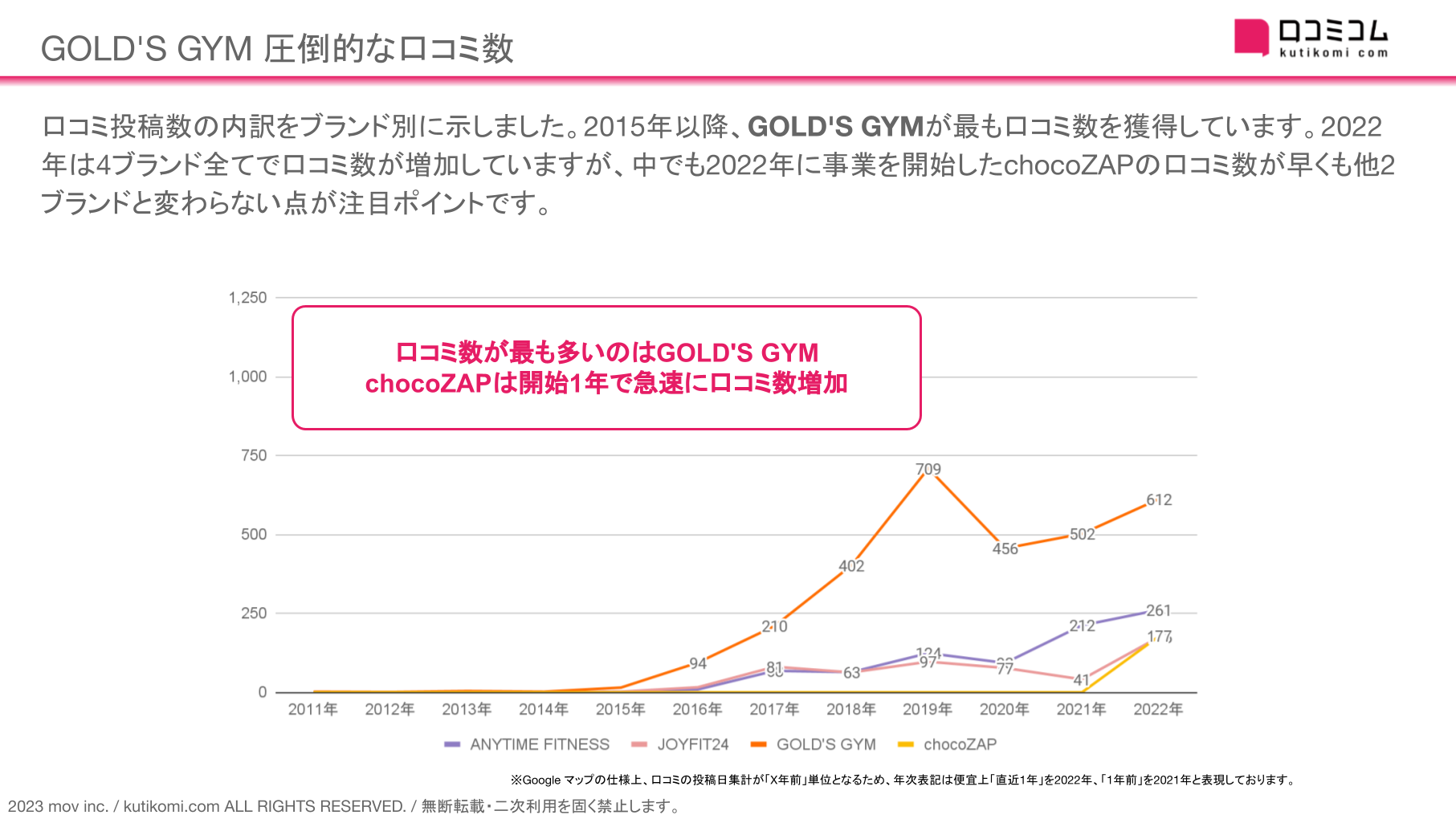 口コミ投稿数の内訳をブランド別に示しました。2015年以降、GOLD'S GYMが最も口コミ数を獲得しています。2022年は4ブランド全てで口コミ数が増加していますが、中でも2022年に事業を開始したchocoZAPの口コミ数が早くも他2ブランドと変わらない点が注目ポイントです。