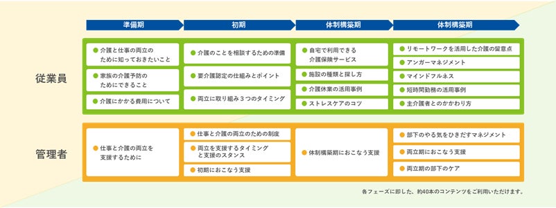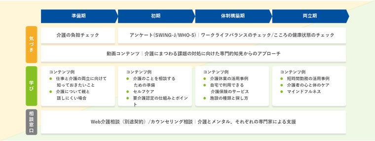介護の準備期から介護初期、体制構築期、両立期に至る一連の時期に渡り、段階ごとに適切な支援策を提供し当事者を支援するとともに、企業の担当者にとっては一次対応の効率化につながるものと捉えています。