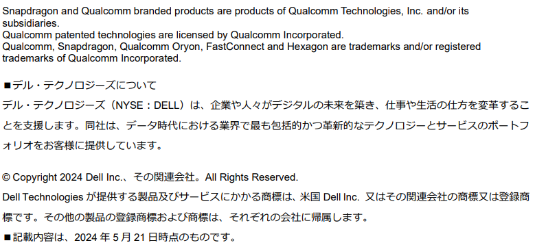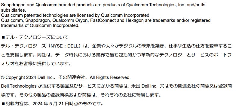 詳細については、「デル・テクノロジーズ、Copilot+ AI PC 5製品を発表 (URL:https://www.dell.com/ja-jp/lp/snapdragonx-laptops)」をご参照ください。