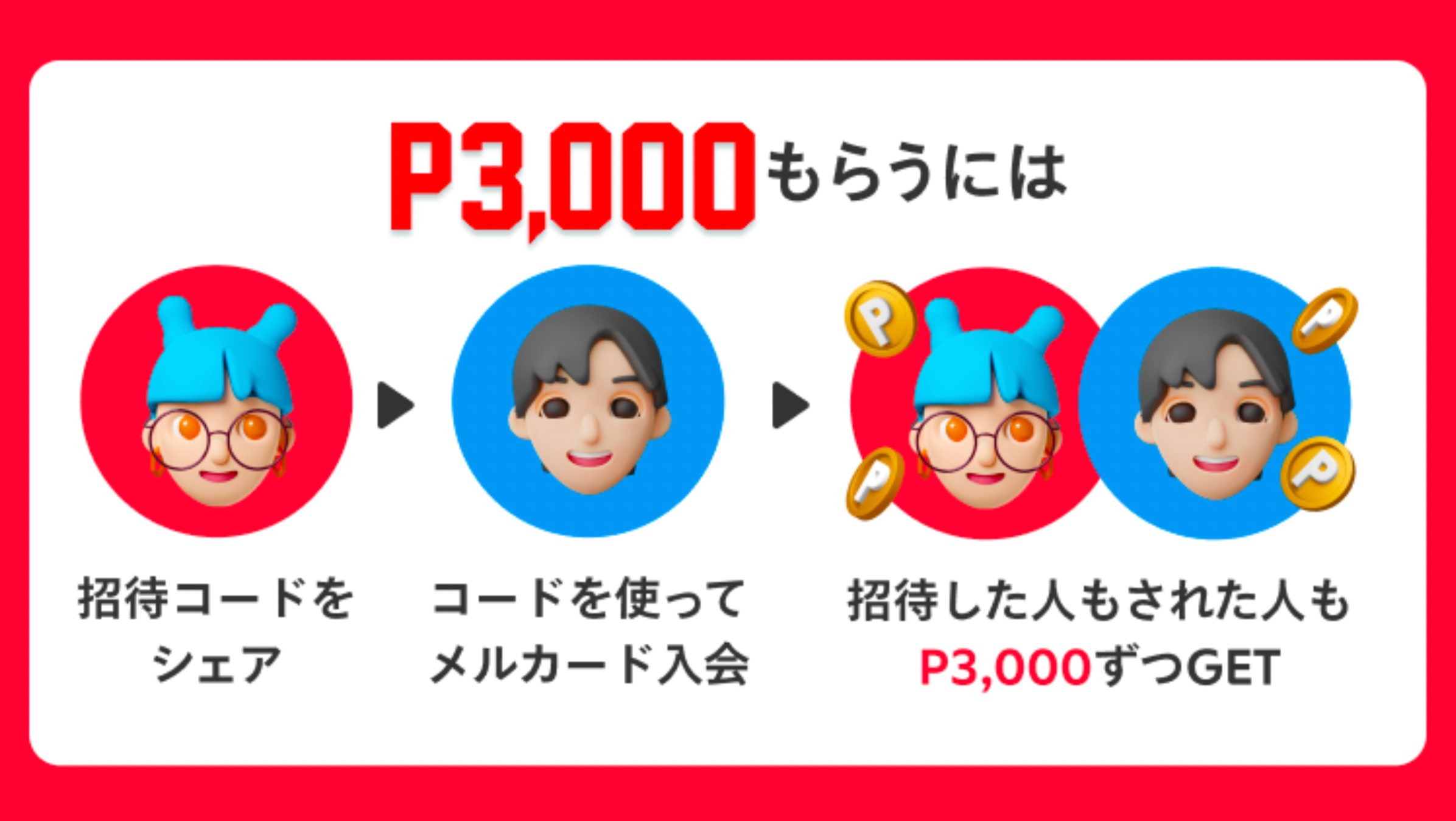 ■対象条件 キャンペーン期間中、下記の条件をすべて満たしている方が対象です ・「招待した人」 キャンペーンページ上に表示される招待コードを招待したい人にシェアしていること ※「メルカード」を持っていないお客さまも参加できます ※「招待された方」が参加条件を満たしていない場合には、キャンペーン対象外となります ・「招待された人」 「招待した人」の招待コードを使って「メルカード」の新規入会登録を完了し、入会審査を通過していること ※過去に一度でも「メルカード」へ入会されたことがあるお客さま(「メルカード」の解約を含む)はキャンペーン対象外となります ※満20歳未満のお客さまはご利用いただけません ※2023年8月1日 (火)00:00〜2023年8月15日(火)23:59に、上記条件が完了しない場合、対象外となります ■キャンペーン期間 2023年8月1日 (火)00:00〜2023年8月15日(火)23:59 ■付与金額と内容 「招待した人」「招待された人」それぞれに3,000円分のポイント ※ポイント付与の際には、アプリ内画面下の「お知らせ」でご連絡します ※ポイントの付与はお客さまのご利用状況やシステム上の都合などにより遅延する場合があります ■キャンペーンの参加方法 【招待した人】 (1)招待コードをシェアする キャンペーンページ上に表示される招待コードを、招待したい方へメッセージの送付やSNS上への投稿などの方法でシェア (2) 「招待された人」が招待コードを入力のうえ「メルカード」に申し込み、入会審査が完了するとポイントが付与される 【招待された人】 (1) 「メルカリ」の会員登録を済ませ、 本キャンペーンページに進む (2) キャンペーンページの「招待コードで入会する場合はこちら」から招待コードを入力し、「メルカード」の入会申請に進む ※「招待コードで入会する場合はこちら」ボタンから「メルカード」の申込みを開始しない場合、キャンペーンの対象外となります (3) 利用規約等に同意する ガイドに従って利用規約等への同意を行ってください (4) 電話番号の認証をする ご登録されている電話番号にSMSをお送りいたします (5) 「メルカード」の登録情報を入力する 氏名、職業、カードお届け先情報等の必要事項を入力し、入会申し込みを完了します。 ※「メルカード」の入会審査には、通常1〜2日お時間をいただきます。場合によっては3日以上お時間をいただくことがありますので、余裕をもってお申し込みください ※「メルカード」の入会審査の結果、発行を見送らせていただいた場合にはポイント付与対象外となります (6) 3,000円分のポイントを受け取る 入会審査完了後、3,000円分のポイントが自動で付与されます。 ※2023年8月1日((火)00:00〜2023年8月15日(火)23:59に、条件が完了しない場合、対象外となります。 ※「招待した方」、「招待された方」が同一人物と判断された場合、キャンペーン対象外となります その他キャンペーンの詳細は以下をご確認ください。 |