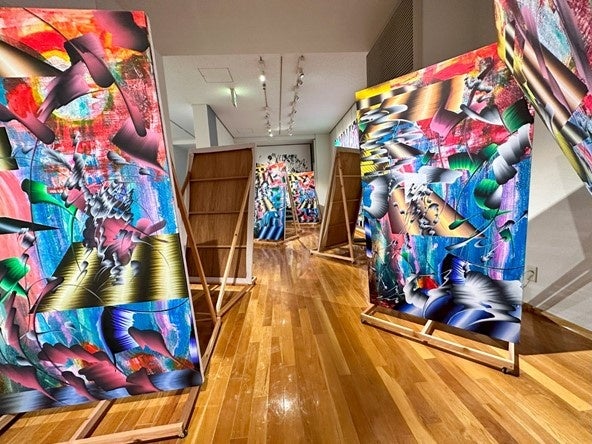 これまで「現代の風景画(遠近法)」をテーマに、グラデーションの線やインターネット上に存在する画像を組み合わせた作品などを制作してきた。本展では「博多べい」と呼ばれる壁から出発し、解体・再構築の果てに、新たな風景としての絵画をインスタレーションとして展示する。