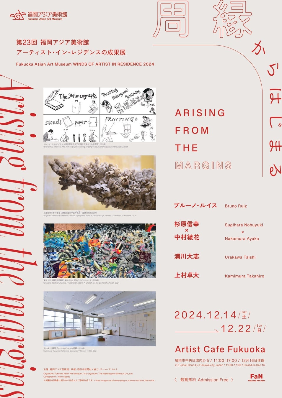 福岡アジア美術館との共催事業として、第23回福岡アジア美術館アーティスト・イン・レジデンスの成果展2024 『周縁からはじまる』(株式会社西日本新聞社〔本社:福岡市中央区〕共催)を2024年12月14日(土)から12月22日(日)まで実施いたします。