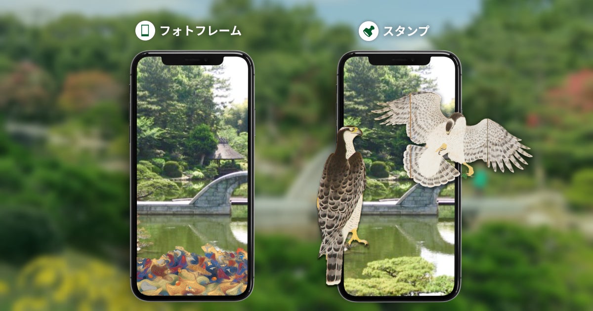 スマートフォンのカメラ越しに見た縮景園を背景に、児玉希望の作品画像を自由に配置、撮影することができます。ブラウザ上で鑑賞できるので、ぜひ気楽に足をお運びいただき、児玉希望作品に親しんでもらえたら幸いです。
