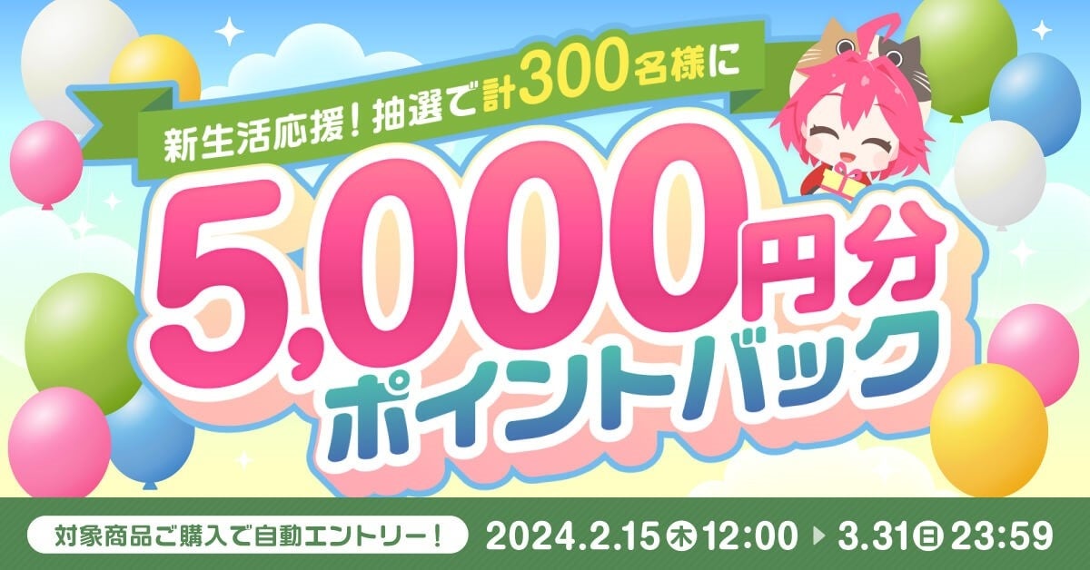 期間中に、対象のカテゴリ内の商品をお買い上げのお客様の中から抽選で計300名様に、当店でご利用いただける5,000ポイントをプレゼントいたします。