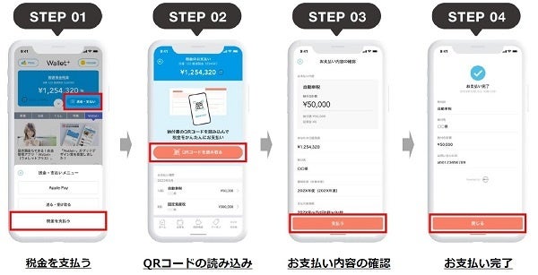 地方税統一QRコード(*2)を読み取ることで簡単に納税することが可能となります。Wallet+内で税金を
