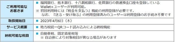 株式会社ふくおかフィナンシャルグループ(代表取締役社長 五島 久)傘下のiBankマーケティング株式会社(代表取締役社長 明石 俊彦、以下「iBank社」)は、 スマートフォン専用アプリ「Wallet+(ウォレットプラス)」にて、「税金を支払う」機能を追加し、2023年4月6日にサービスの提供を開始致します。