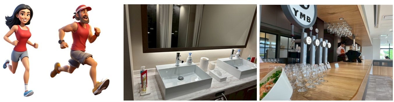 「Runtrip BASE YOYOGI PARK」にはシャワーとメイクルーム、上質なアメニティはもとより、マッサージルーム、カフェ&バー「mariness café」まで併設され、ランニングを生活の一部として取り入れやすい設計となっています。