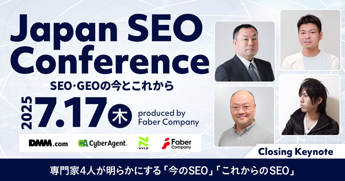 株式会社Faber Company(本社:東京都港区、代表取締役:稲次 正樹、古澤 暢央)は、2025年7月17日(木)に開催するSEOカンファレンス「Japan SEO Conference 2025(#JSC25)」のクロージングキーノートセッションの内容を公開したことをお知らせします。