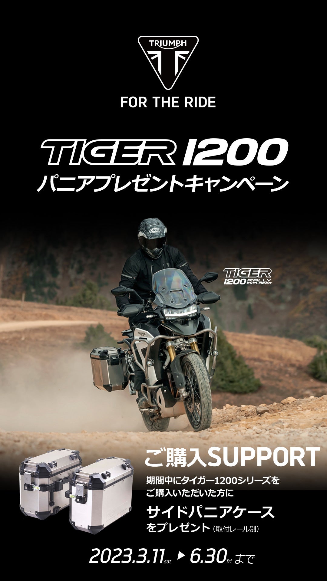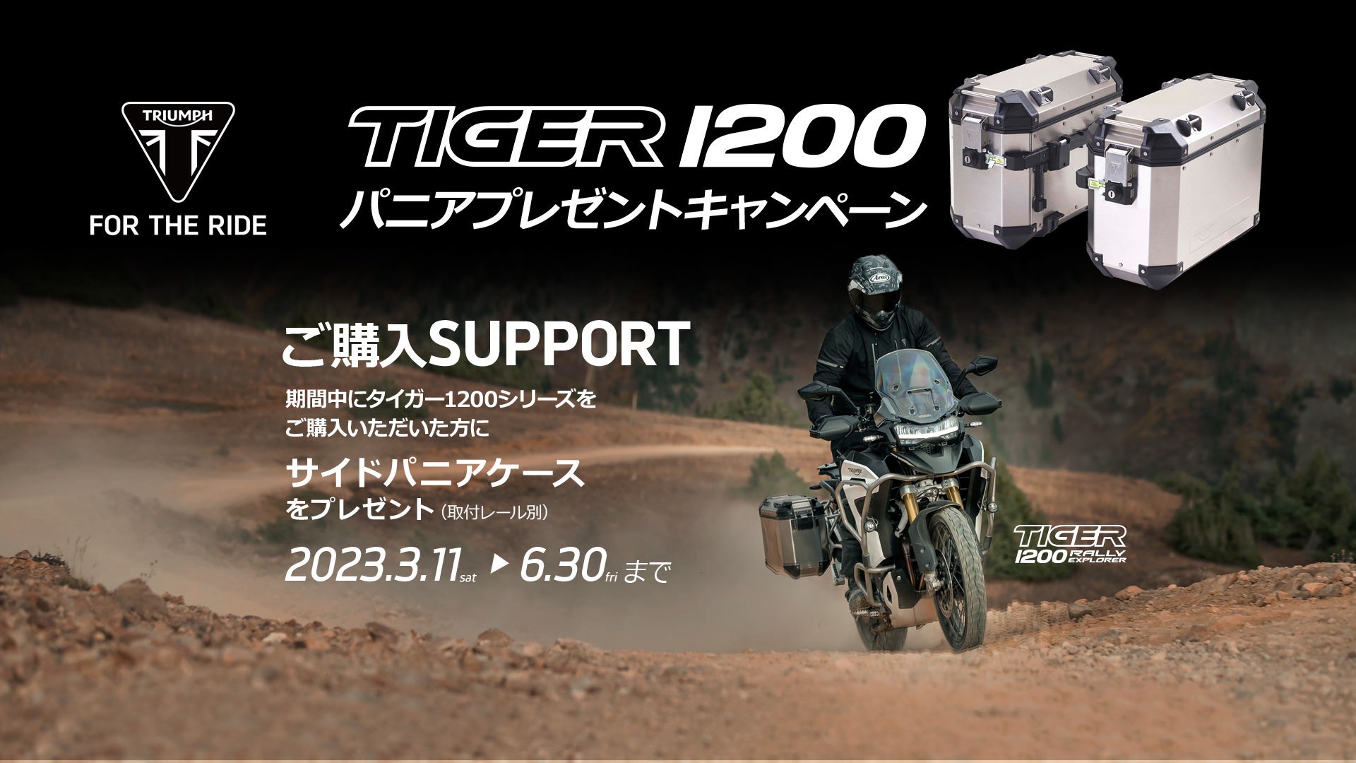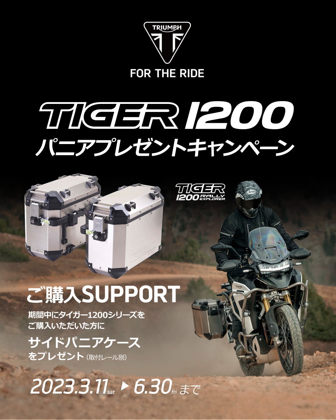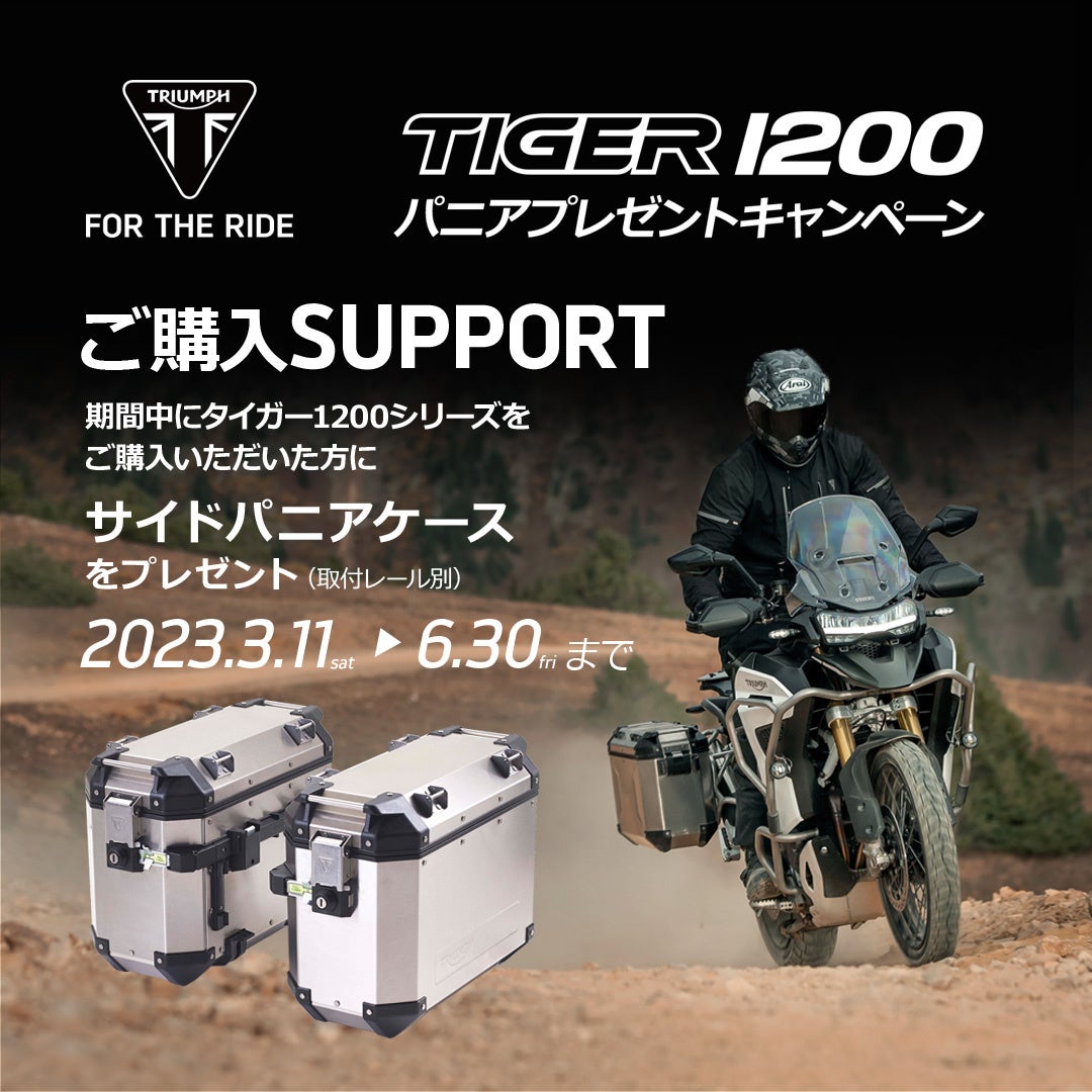 3月11日~6月30日までの期間中、全国のトライアンフ正規販売店にてTIGER 1200ファミリーの新車をご成約いただいた方へ、サイドパニアケースをプレゼント