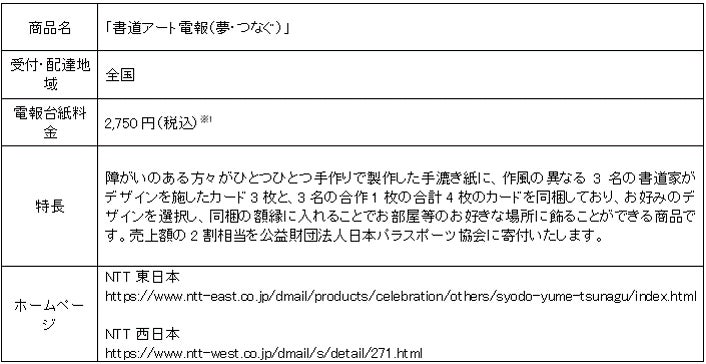 NTT東日本及びNTT西日本は、パラスポーツの普及・強化等を支援するため、2015年5月29日(金)から、寄付付き電報「書道アート電報(夢・つなぐ)」を販売してまいりました。