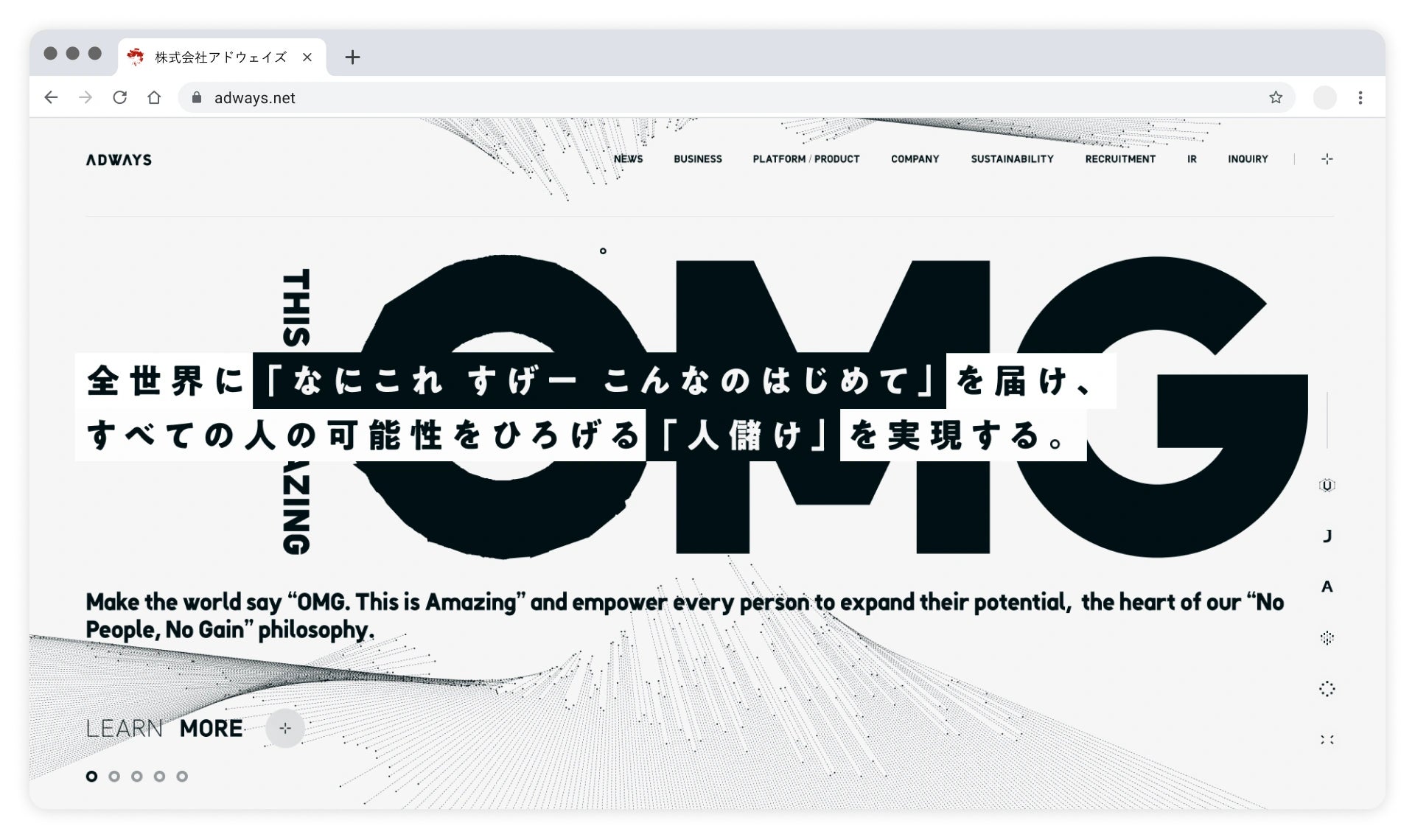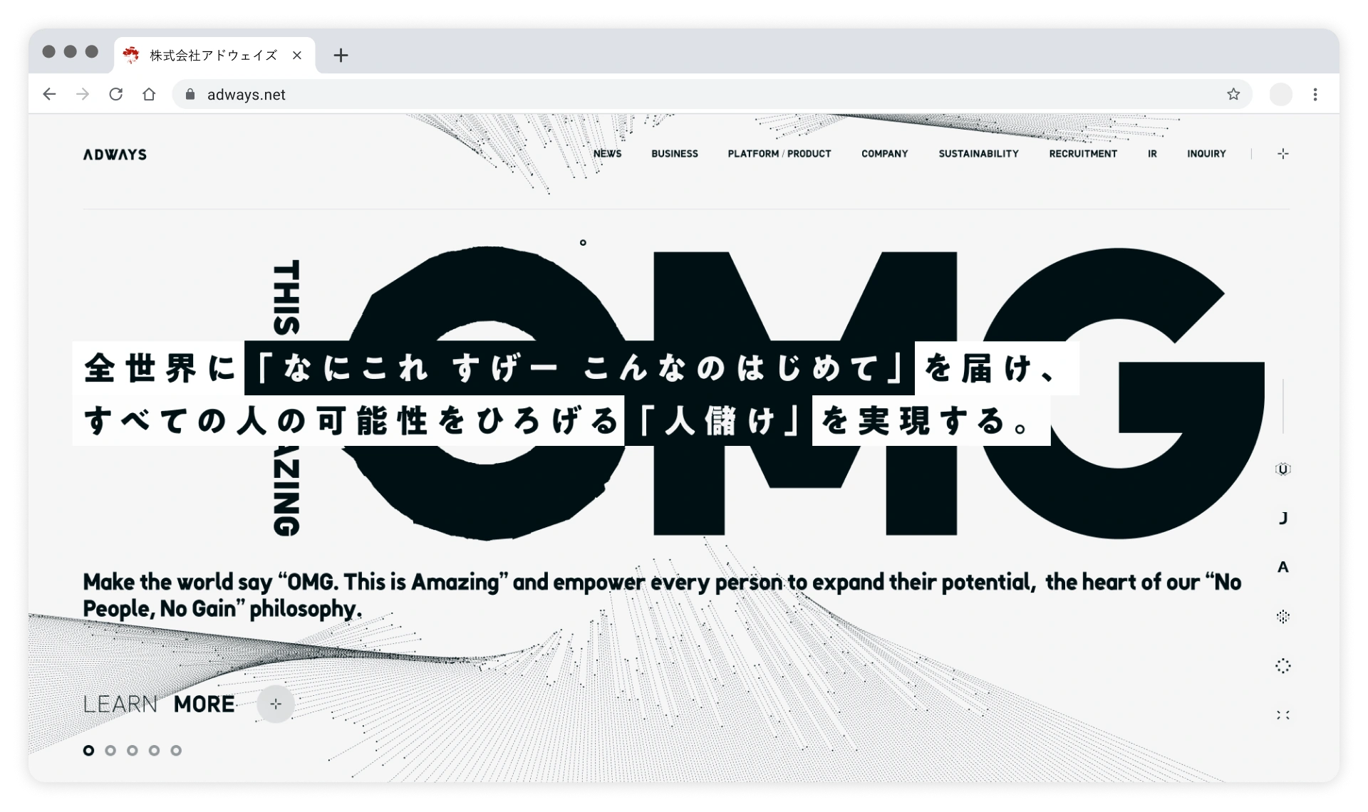 アドウェイズは2001年の設立以来、アフィリエイト広告事業を皮切りに、スマートフォンの普及を契機に拡大したアプリ市場におけるプロモーション支援や、機械学習を用いた独自プロダクトの開発など、市場の変化や発展に応じてデジタル広告事業を展開してまいりました。 現在は「全世界に『なにこれ すげー こんなのはじめて』を届け、すべての人の可能性をひろげる『人儲け』を実現する。」というパーパスのもと、広告領域にとどまらず事業領域を拡大し、日本のみならず、アジアを中心とした海外にも事業展開を行っております。