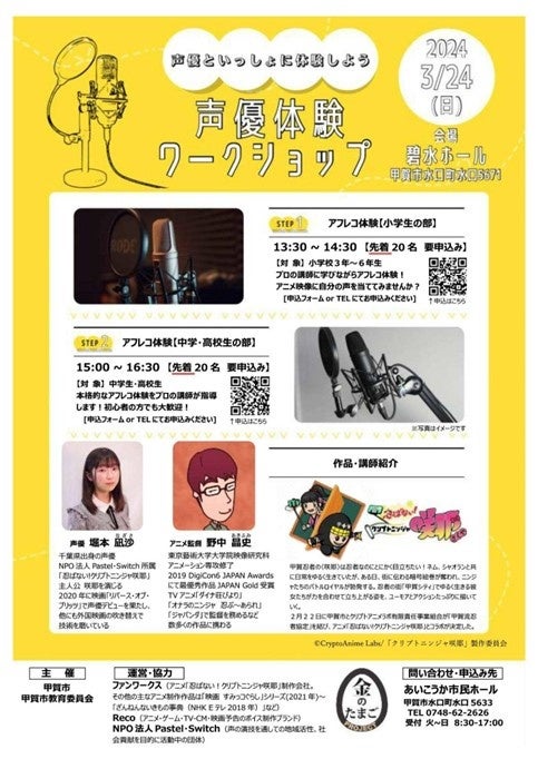 また、4月1日(月)から始まるTVアニメの再放送・「CryptoAnime Labs」と滋賀県甲賀市との連携協定の一環としての「声優体験ワークショップ」開催(開催場所:滋賀県甲賀市)が決定しました。