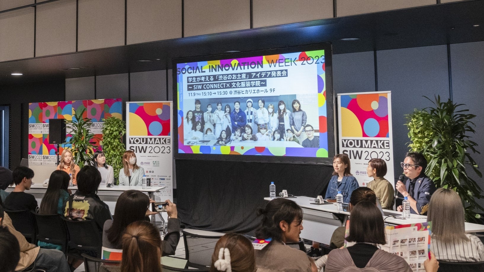 今年のSIWでは、学生が参画するプログラムや、学生向けのワークショップを実施します。メイン会場であるヒカリエホールの初日には、文化服装学院ファッション流通高度専門士科4年の「次世代ファッションビジネス」の授業とのコラボレーションで、学生が考える渋谷のお土産アイデアのプロトタイプ「渋サン」を発表しました。授業では、7つのチームにわかれて、課題の抽出や市場動向などの調査と商品コンセプトの設計を行い、それぞれが考えた渋谷のお土産アイデアを具現化したサンプルをSIWの会場で展示しています。