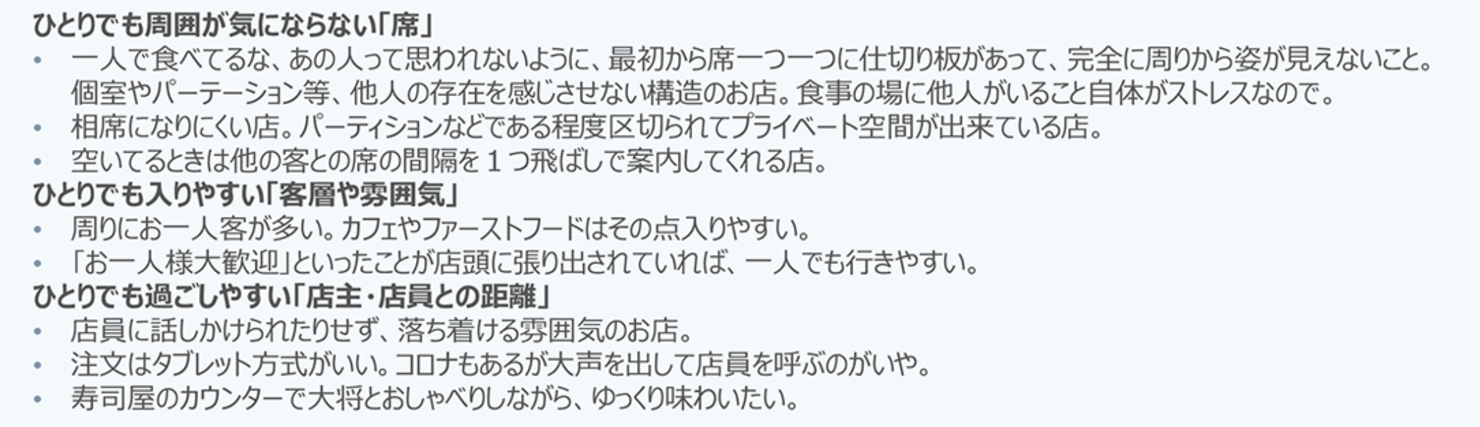 また、同調査の「ひとりで行きたい飲食店」の特徴としては、パーテーションなどで仕切られている、ひとりでも周囲が気にならない「席」のあるお店という意見が多かったです。また、ひとりでも入りやすい「客層や雰囲気」、注文はタブレット方式のあるお店がよいとの声もありました。