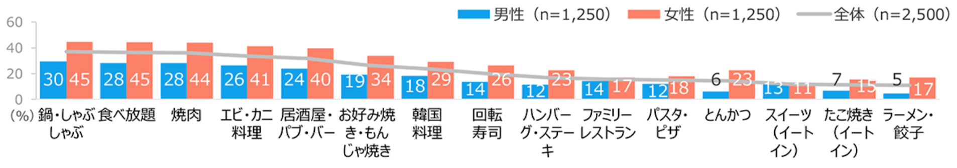 マーケティング・リサーチ会社のクロス・マーケティングが実施した「おひとりさま消費に関する調査(2022年)外食編」によると「ひとり外食への抵抗感がある飲食店」として「鍋・しゃぶしゃぶ」「食べ放題」「焼肉」が上位 TOP3に上がりました。