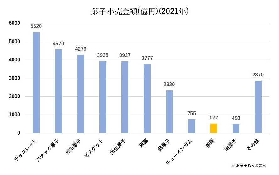 コロナ禍で観光客や出張・インバウンド需要が激減し、土産菓子業界は深刻な打撃を受けています。そこで、土産菓子業界や地方を盛り上げたいという思いで、この度、全国8地方の大人気煎餅食べ比べセット「せんべい甲子園BOX」を発売し、「せんべい甲子園」を開催することに決定いたしました。近年、Instagramやお取り寄せブームにより、“映えスイーツ”が流行しています。一方で、煎餅を食べる頻度が「月に1回以下」という人が全体の約3割でもっとも多くなっていて、食べる頻度の少なさが顕著になっております。(出典:LINEリサーチ)また、それに伴い、煎餅の小売り金額は菓子全体の中でかなり小規模になっております。(グラフ参照)