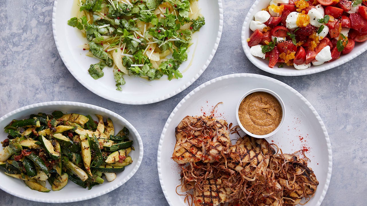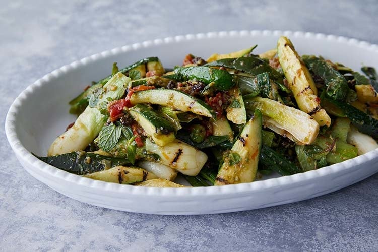 ローストしたズッキーニと葉玉ねぎを、グリーンオリーブのタップナードとドライトマトでシンプルに仕上げたサラダ。アクセントに加えた爽やかなミントが香る、カラダにも嬉しいプラントベースのデリ。