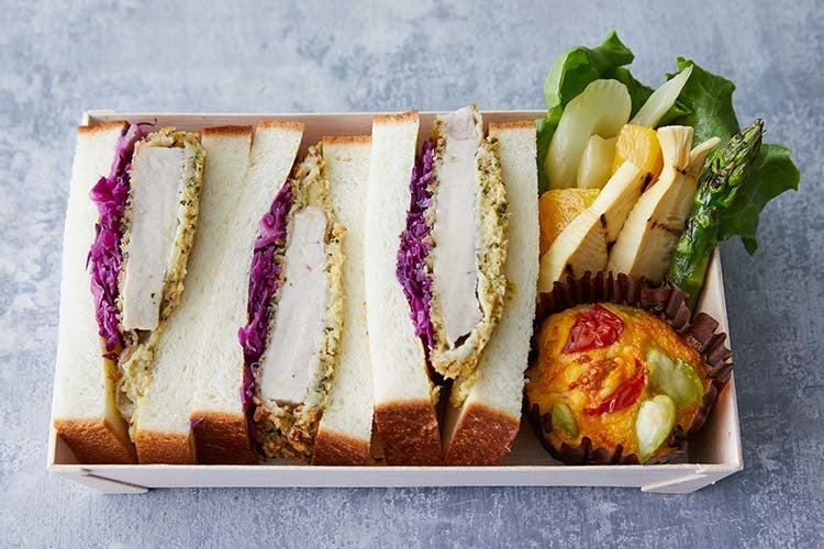 ミックススパイスを加えたパン粉で揚げた豚のカツとズッキーニのフムスを挟んだカツサンドに、春野菜のフリッタータとマリネを添えました。