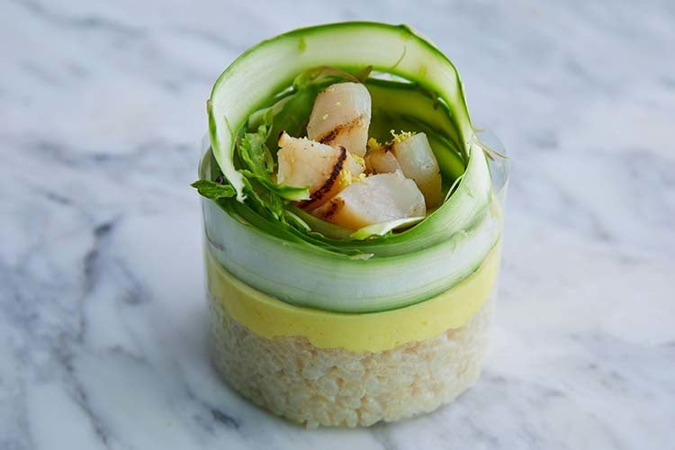 レモンの風味が爽やかな味わいのリゾット。玄米のプチプチした食感と長くスライスしたアスパラの食感、グリルしたホタテの香ばしさがたのしい一品。
