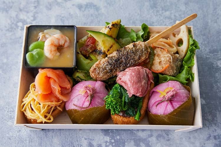 サーモンとローストビーフの稲荷寿司に桜の手毬寿司や蛤の茶碗蒸し、豆腐つくねのふき味噌焼きなど春の食材満載のお弁当。
