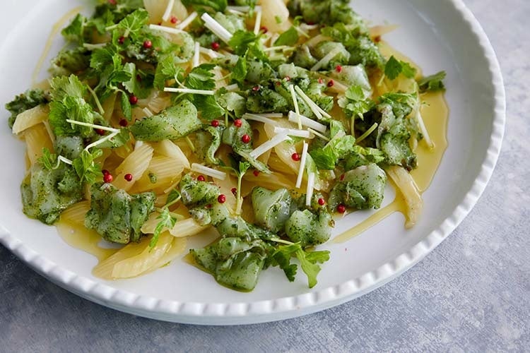 旬を迎える爽やかな香りのセロリをマリネにし、スズキのカルパッチョと合わせました。仕上げにハーブオイルとピンクペッパーを散らし、春色のサラダに仕立てました。