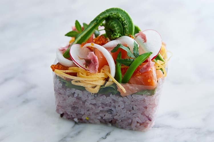 春色に炊き上げた酢飯を型に入れ、押し寿司スタイルに。サーモンマリネ、錦糸卵、新玉葱ピクルス、絹さや、とびこ、ラデッシュなど、華やかに盛り付けました。