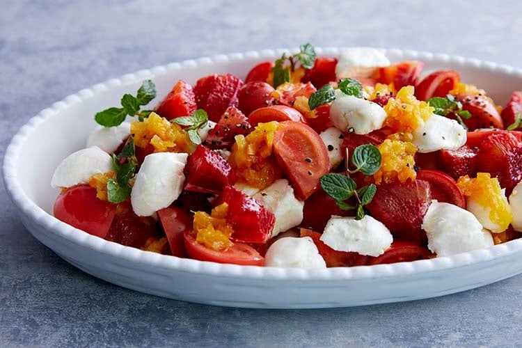 この時期しか収穫できない国産ブラッドオレンジとフルーツトマトを、ミルキーでもっちりした食感の本格モッツァレラ「ブファラボッコンチーノチーズ」と合わせて、カプレーゼにしました。オレンジから手づくりのコンフィチュールとミントを散らし爽やかに仕上げました。