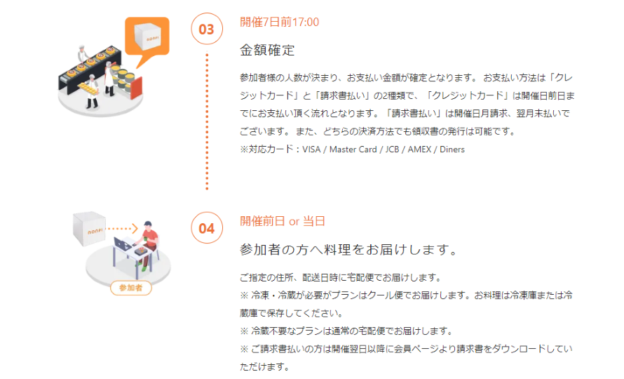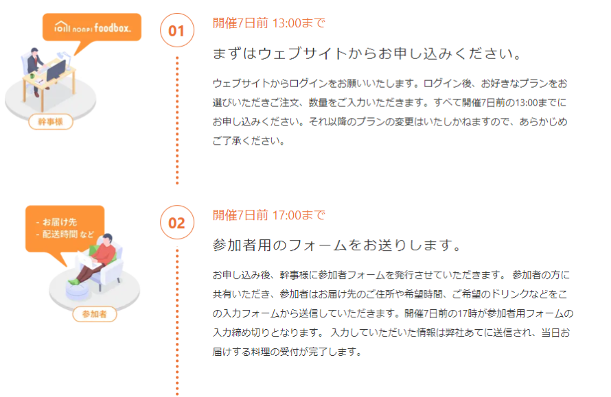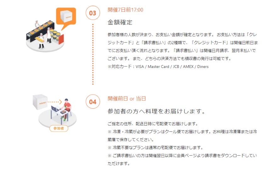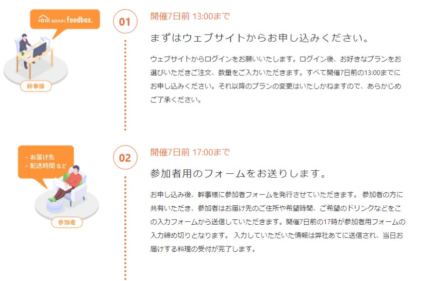 nonpi foodbox®はオンライン、対面、ハイブリッド、様々な形式の集まりで手軽に食事手配ができるデリバリーサービスで、料理や飲み物を全国にお届けしております。