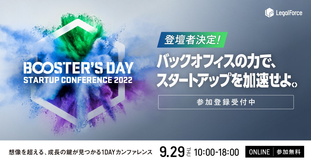 AI契約審査プラットフォーム「LegalForce」、AI契約管理システム「LegalForceキャビネ」を提供する株式会社LegalForce(本社:東京都江東区、代表取締役:角田望、以下LegalForce)は、9月29日(木)10:00より、スタートアップのバックオフィスをテーマとしたオンラインカンファレンス「STARTUP CONFERENCE 2022 BOOSTER’S DAY」を開催します。