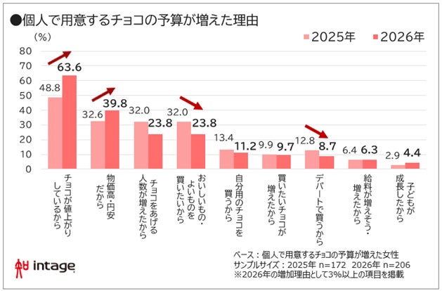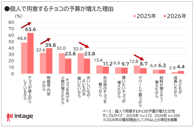 ・予算増の理由は「チョコの値上がり」63.6%、「物価高・円安」39.8%で大幅増加。逆に「おいしいものを買いたい」は減少