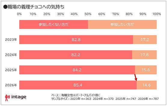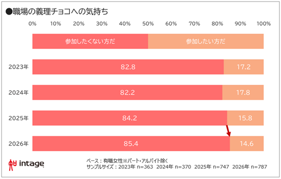 ・有職女性で職場の義理チョコに「参加したくない」は85.4%で、2022年に調査を開始して以来の最高値