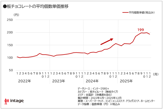 実際にチョコはどのくらい値上がりしているのでしょうか。全国約6,000店舗の販売実績を継続的に収集している小売店販売データSRI+®(全国小売店パネル調査)で、板チョコレートの平均個数単価の推移を確認しました。2022年上半期までは100円前後(税込み)で推移していた単価が、その後ゆるやかに上がり始め、2024年以降は急激に上昇し、2025年9月には199円と、200円に迫るところまできています(図表4)。