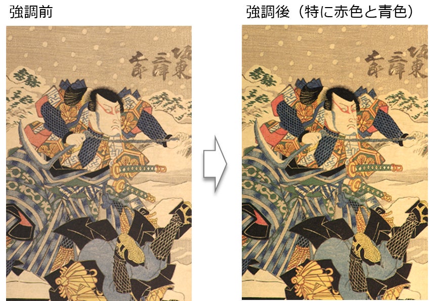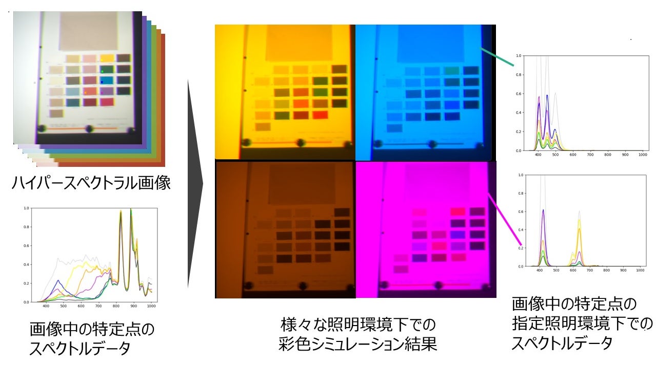 照明シミュレーション技術では、ハイパースペクトル画像から取得した対象物表面の分光特性(どの波長の光を反射・吸収・蛍光するか等)を用いて、様々な照明環境下での対象物の見え方を正確に再現します。また対象物の色や柄が変化して見える条件を探索・再現することで、演出者の意図に合わせた照明条件の設計を可能とします。