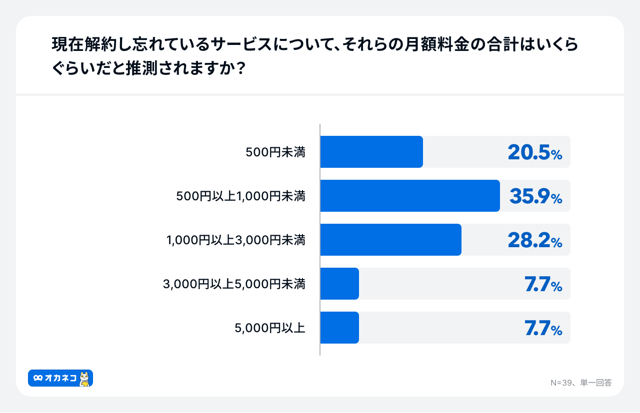 また、この「解約忘れ」層に対しその潜在的な損失額を尋ねたところ、「500円~1,000円未満」が35.9%で最多となりました 。さらに、月額3,000円以上の損失可能性があると推測している層も15.4%(3,000円~5,000円未満 7.7%、5,000円以上 7.7%)存在し、一つ一つの少額な固定費が積み重なる「ちりつも浪費」の実態が示されました。