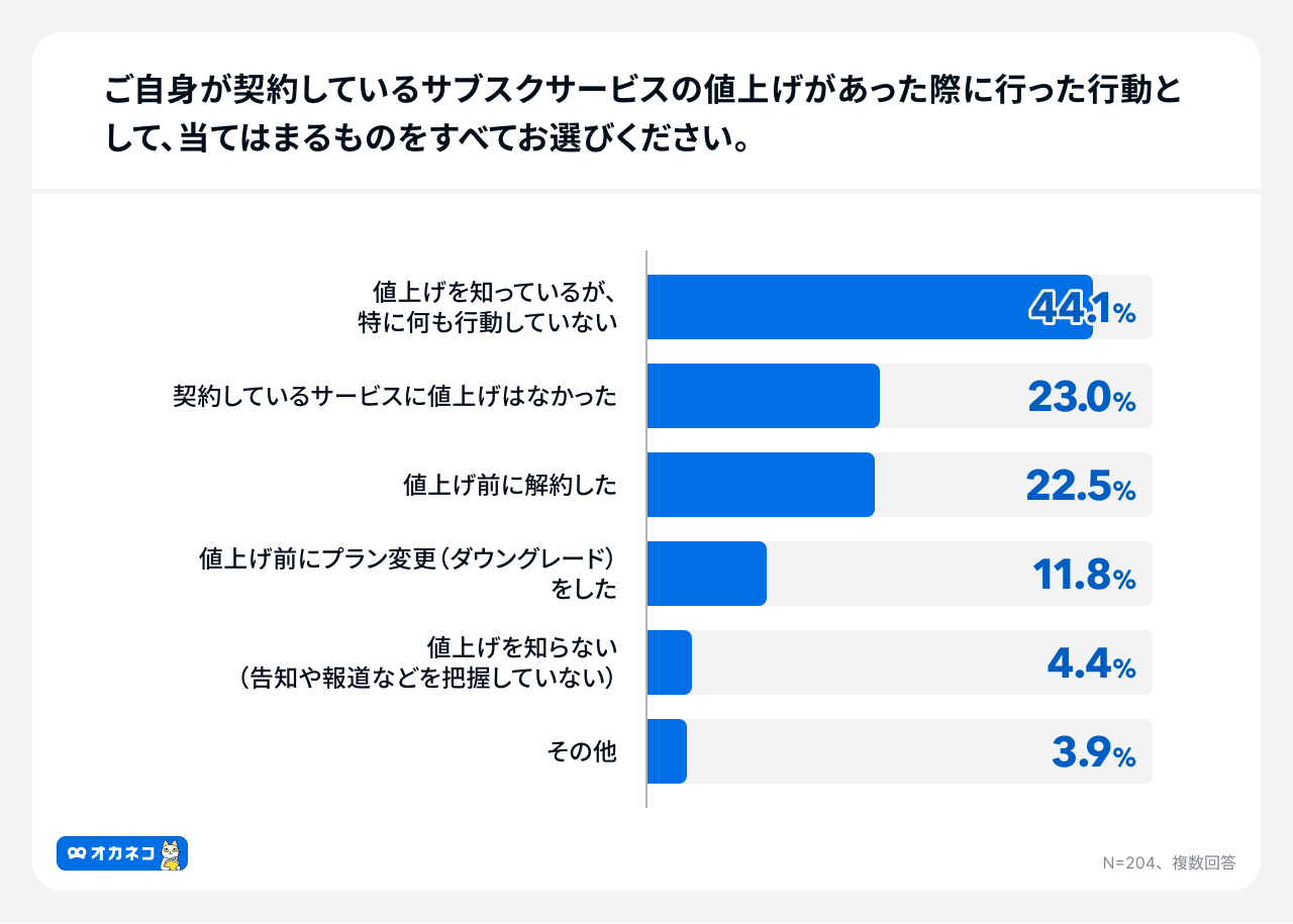 サブスクサービスの値上げがあった際に行った行動については、「値上げを知っているが、特に何も行動していない」が44.1%で最も多い結果となりました 。