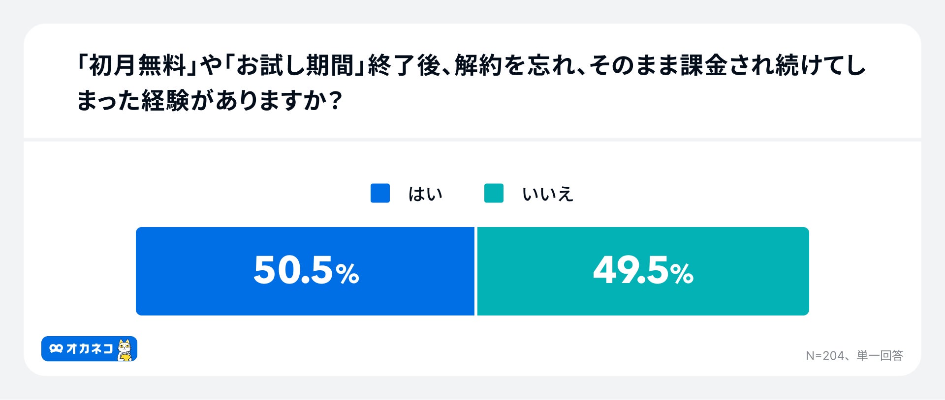 そのうち、「初月無料」や「お試し期間」終了後、解約を忘れそのまま課金され続けてしまった経験があるか尋ねたところ、50.5%が「はい」と回答しました 。契約者の約2人に1人が、自動課金のトラップを経験していることが明らかになりました。