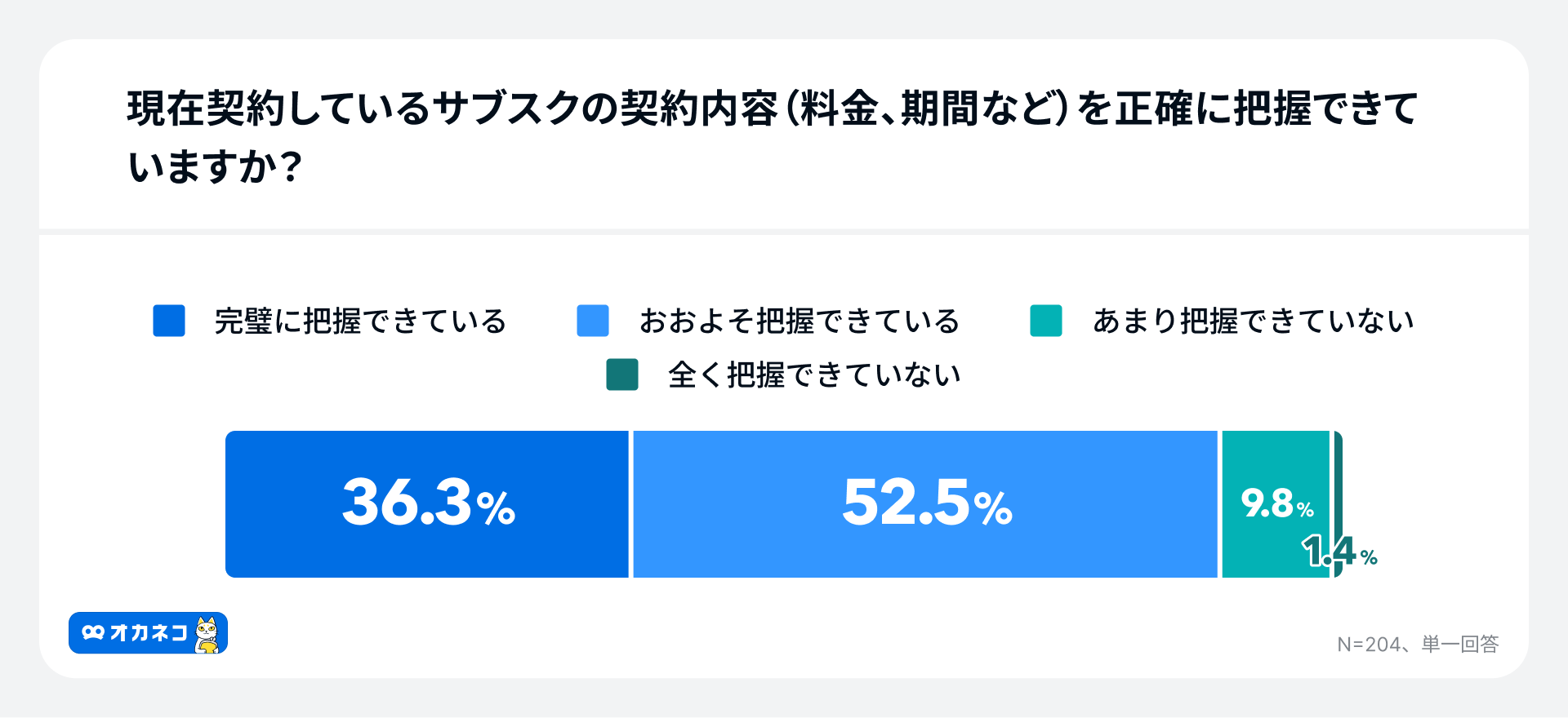現在契約しているサブスクの契約内容(料金、期間など)を「完璧に把握できている」と回答した人は36.3%に留まりました。