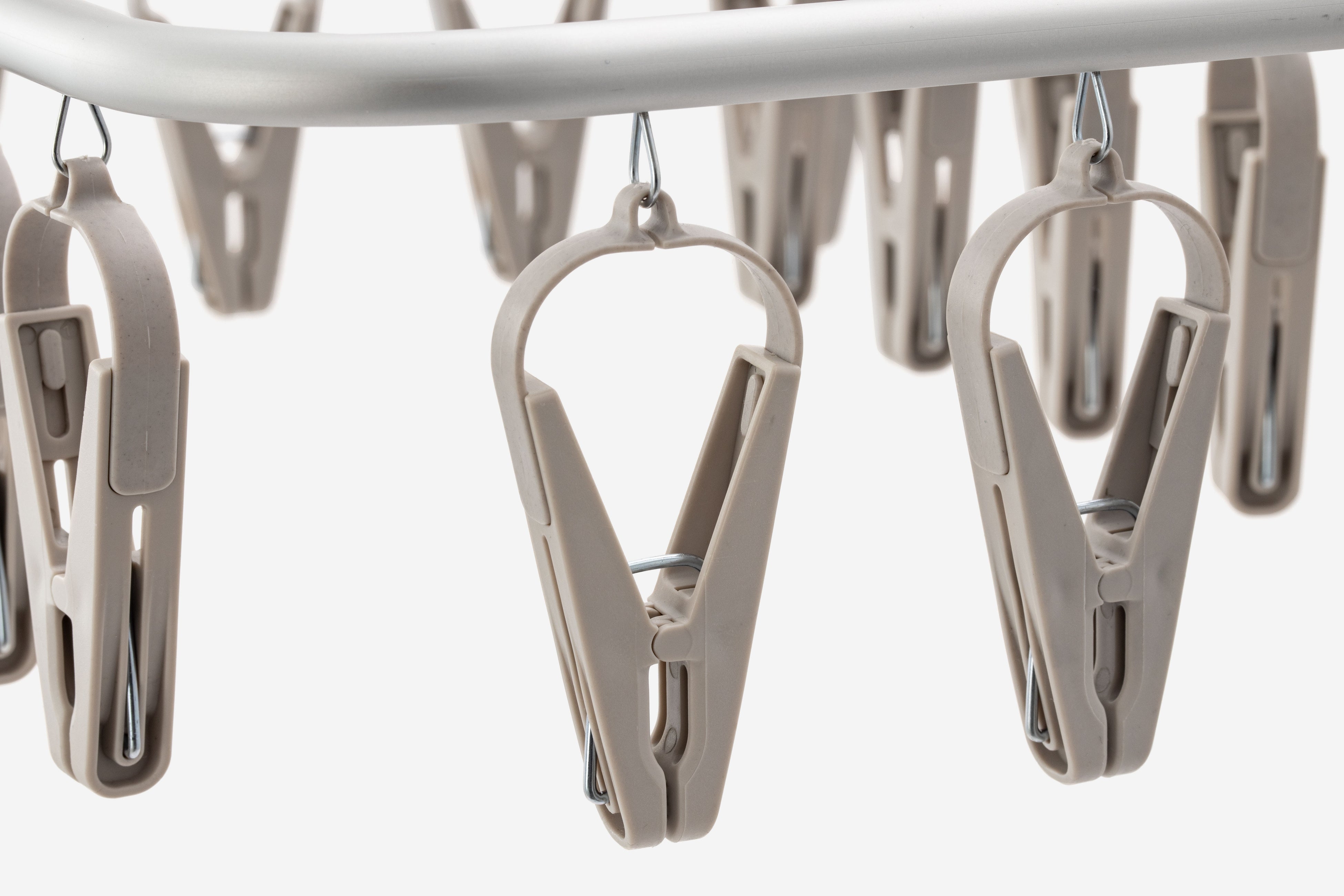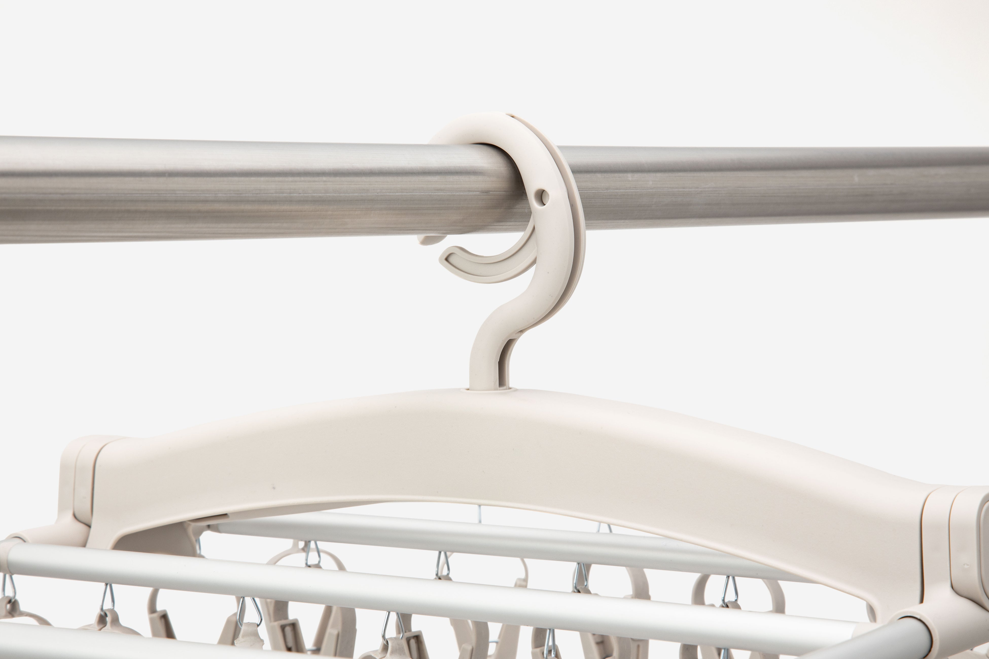 左右のサイドフックでピンチハンガーを3点で支える構造のため、
