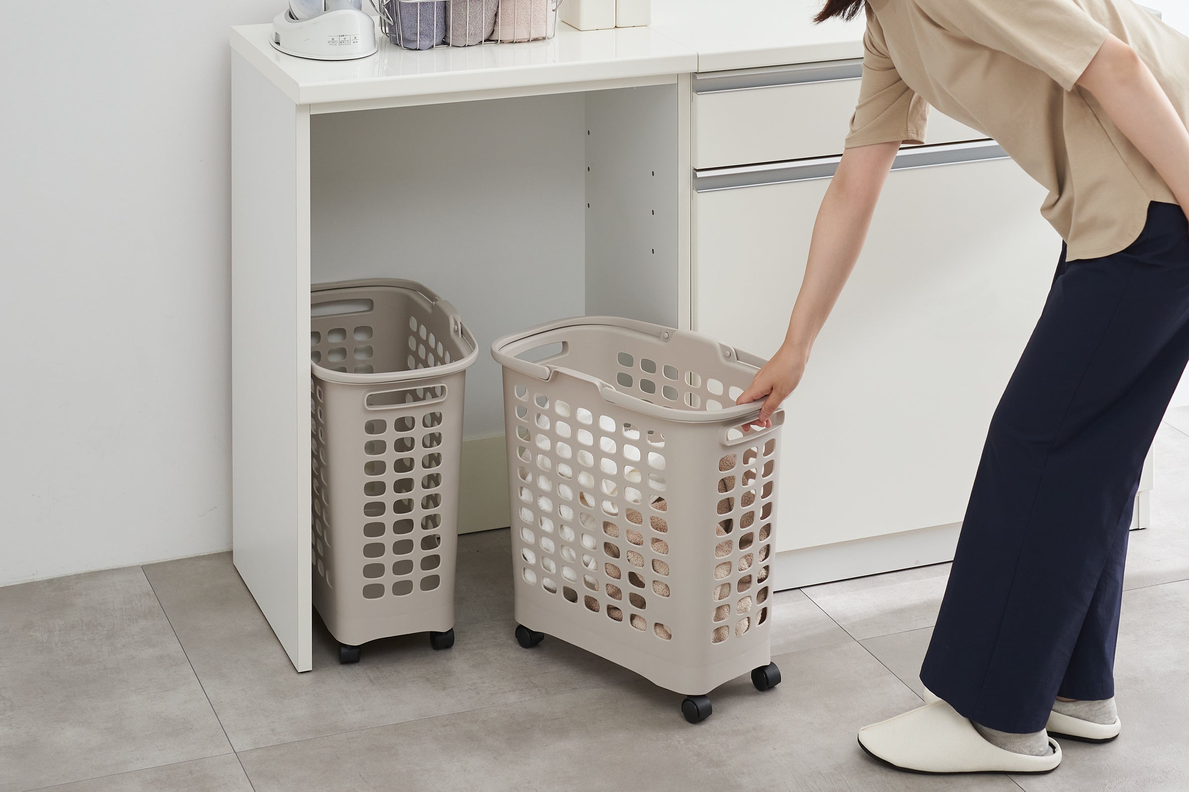 キャスター付きで移動や引き出すのに便利なランドリーバスケットです。スリムなボディで狭い隙間にも収まるため、収納しやすいのが嬉しいポイントです。