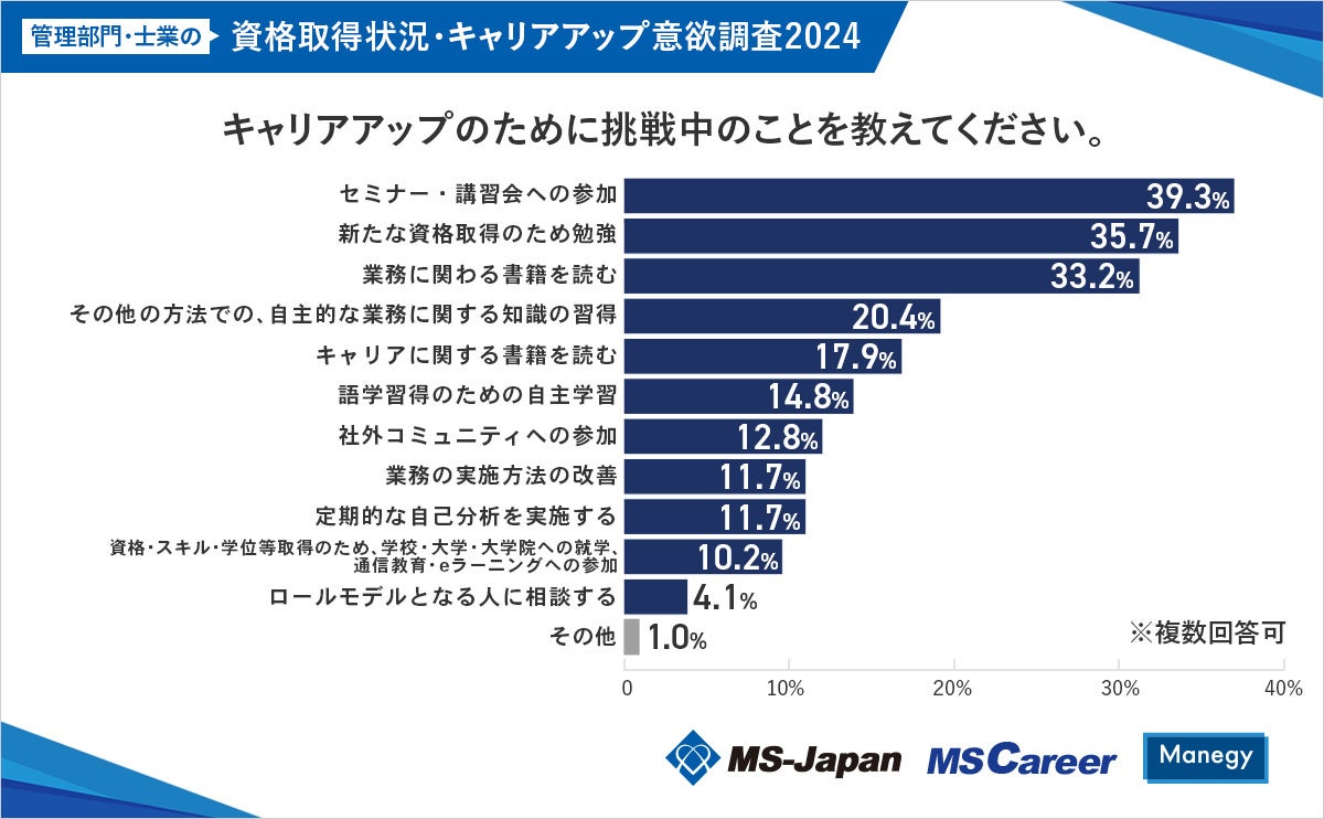 続いて、キャリアアップのためにしていることを調査しました。「セミナー・講習会への参加」が39.3%、「新たな資格取得のための勉強」が35.7%、「業務に関わる書籍を読む」が33.2%と上位を占めており、それぞれ3割以上の方が実施していました。