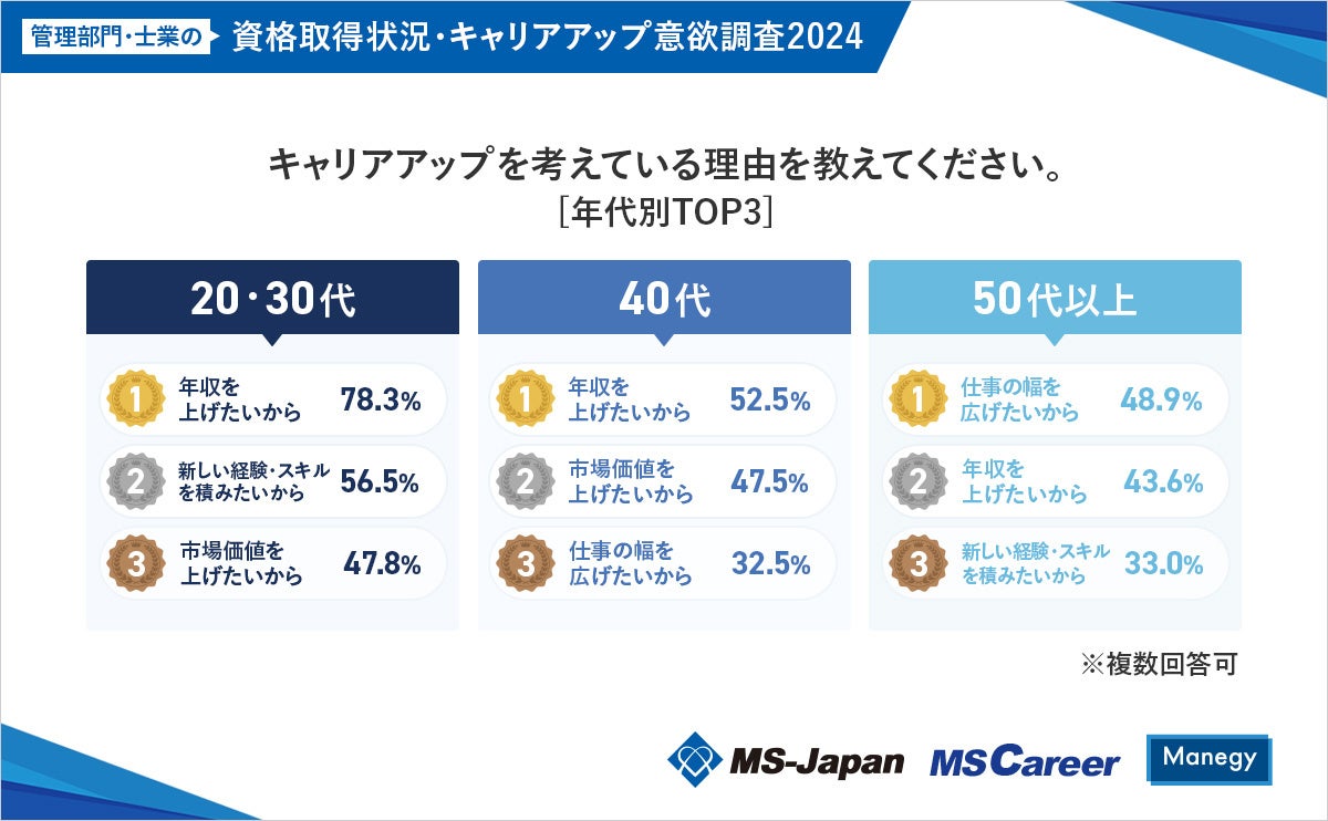 年代別にTOP3を見てみると、若い人ほど「年収を上げたいから」という理由でキャリアアップを考えていました。どの年代においてもTOP3にランクインしているものの、20・30代と50代以上では34.7%の差がありました。
