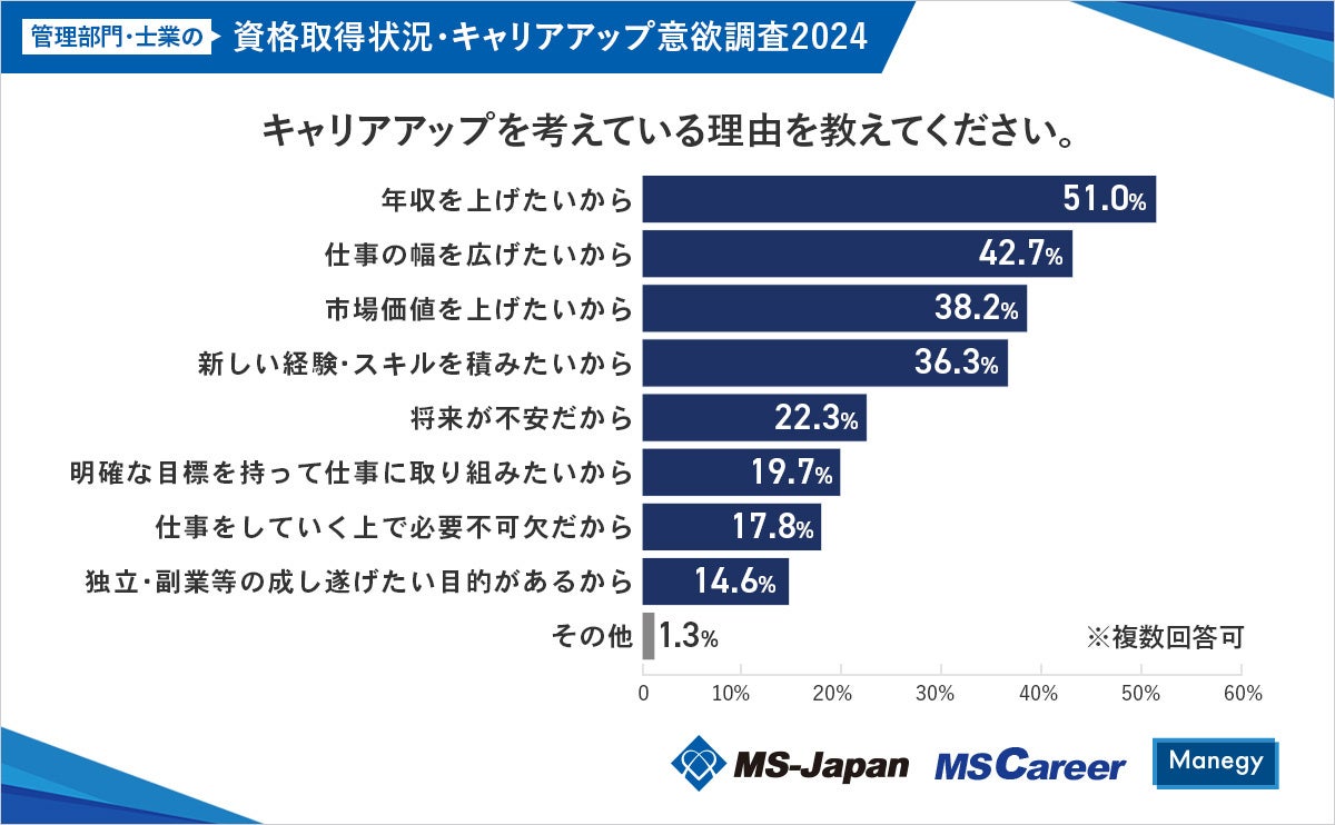 キャリアアップを考えていると回答した方を対象に、キャリアアップをしたい理由を調査しました。半数を超える51.0%の方が「年収を上げたいから」という理由でした。次点で、「仕事の幅を広げたいから」が42.7%、「市場価値を上げたいから」が38.2%と続きました。