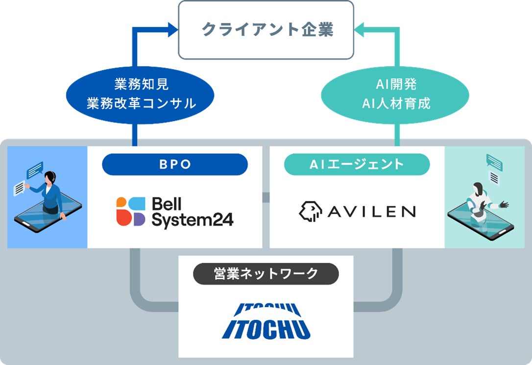 株式会社AVILEN(本社:東京都中央区、代表取締役:高橋 光太郎、以下「AVILEN」)は、株式会社ベルシステム24(本社:東京都港区、代表取締役 社長執行役員:梶原 浩、以下「ベルシステム24」)、伊藤忠商事株式会社(本社:東京都港区、代表取締役社長COO:石井 敬太、以下「伊藤忠商事」)と業務提携契約(以下「本提携」)を締結し、AIエージェントのオーダーメイド開発、実装、AI人材へのリスキリング、BPOを包括的に支援するソリューションの提供を開始しました。これにより、AIソリューションの導入や部分的支援にとどまらず、企業ごとの業務プロセスや課題に応じた最適な支援が可能になります。