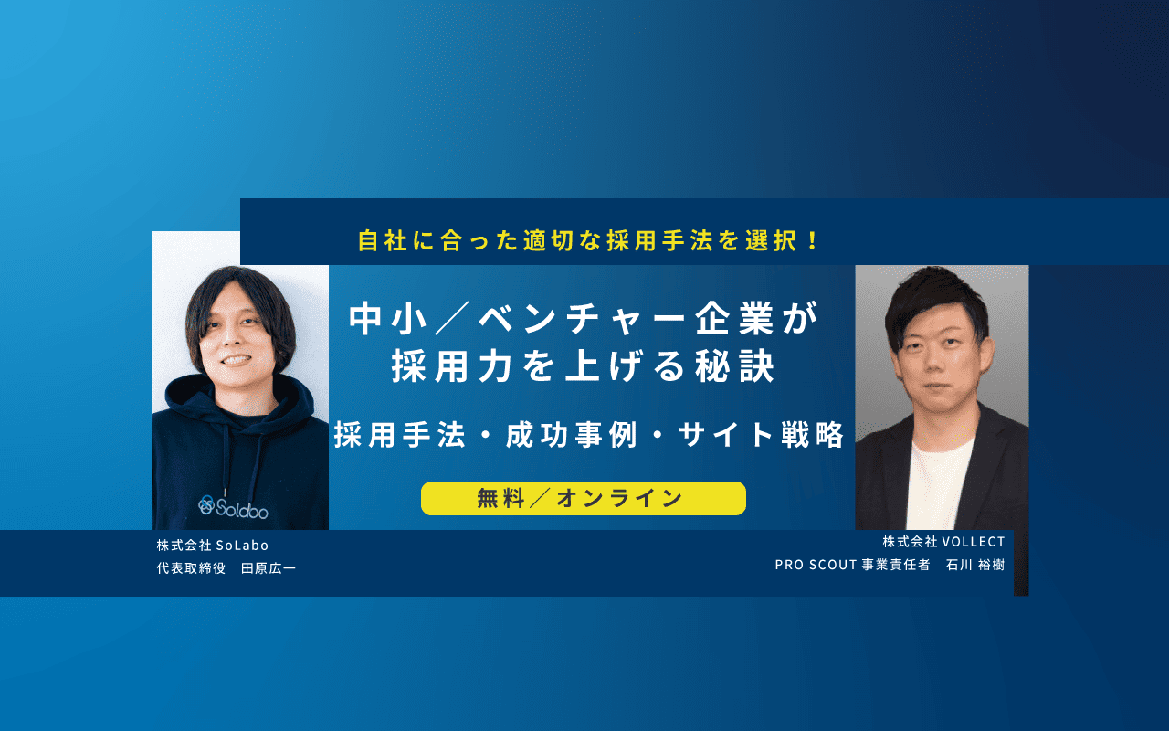 本セミナーでは、株式会社VOLLECTにて、600社以上が導入した採用支援サービス「PRO SCOUT」の事業責任者 石川様が、中小・ベンチャー企業が採用力を上げる秘訣や、中小企業およびベンチャー企業の人事・経営者がぶつかる課題の解決策についても解説いたします。