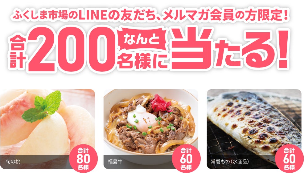 キャンペーン期間中、ふくしま市場で商品を購入後、商品レビュ―の投稿をいただいた先着1,000名様にふくしま市場内で使える500円クーポンプレゼント&LINEの友だち追加・メルマガ登録をいただいた方の中から抽選で合計200名様に福島県産品が当たります。