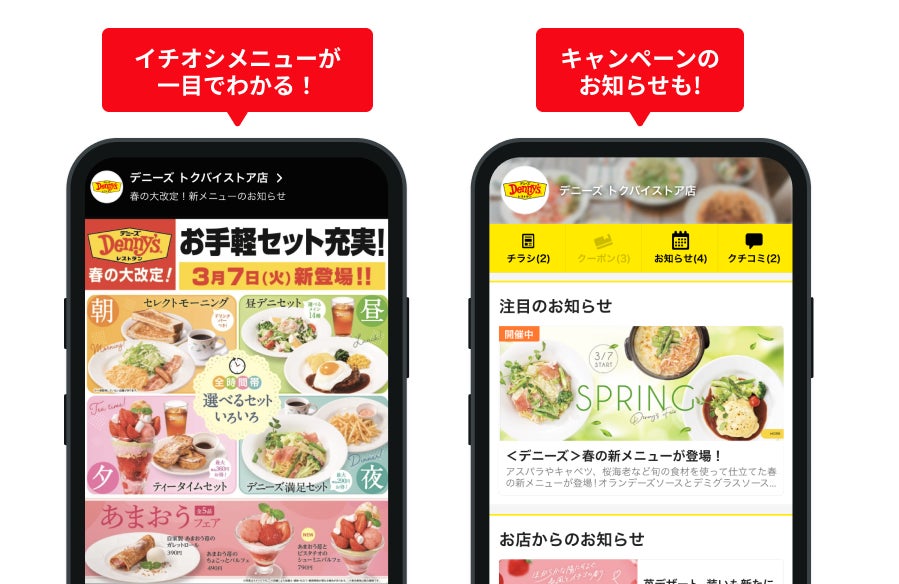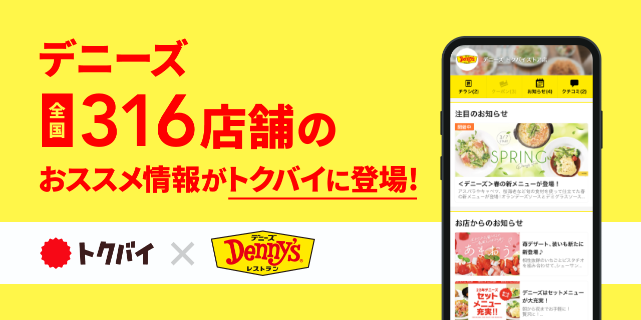 今回、「トクバイ」サービス上に登場したのはファミリーレストラン「デニーズ」全国316店舗となります。これにより「トクバイ」ユーザーは、居住地近くやよく行く店舗の新しい情報を随時知り、活用することが可能になりました。