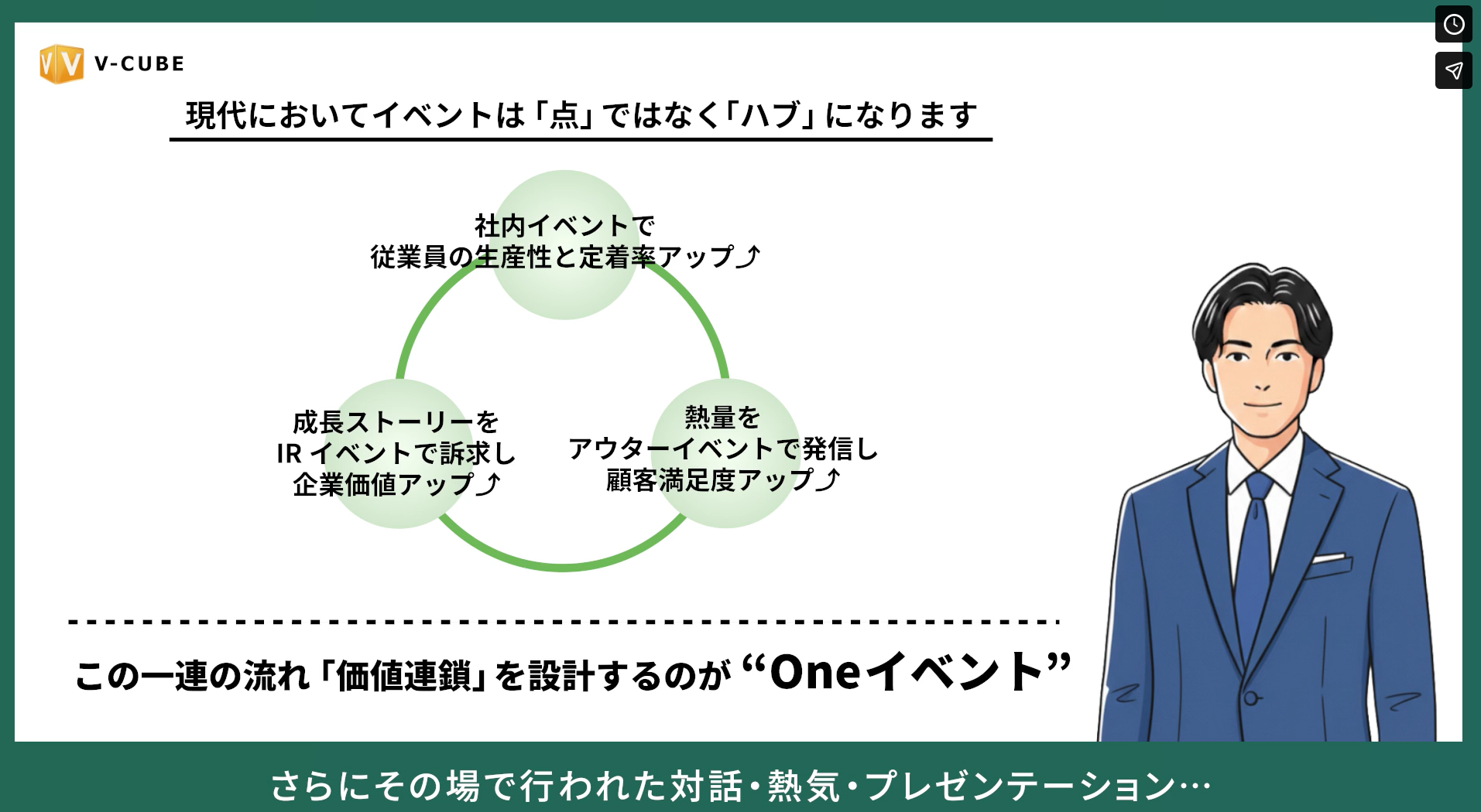 ブイキューブでは、本セミナーにおいて新たなイベント設計に挑戦いたします。「マネジメント層のメッセージが伝わりづらい」という、多くの企業が抱える課題を解決すべく社内プロジェクトチームを発足。最新の音声合成AIやイラスト図解を駆使し、伝達内容の要点を視覚的・聴覚的に整理した動画コンテンツを制作いたしました。