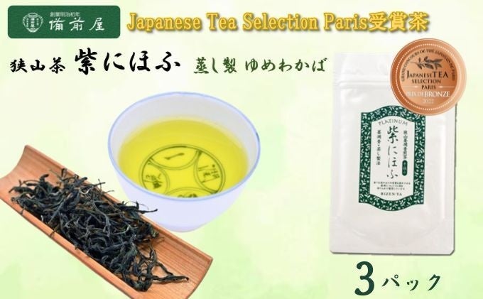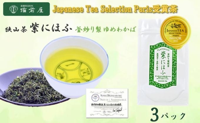 今回新たに登場する返礼品は日高市の狭山茶問屋「備前屋」がお茶の権威ある賞「Japanese TEA Selection Paris」(2023年1月開催)で金賞並びに在仏日本大使特別賞をダブル受賞した「紫にほふ釜炒り製緑茶」他2品とセット商品の合計4品。フランス人の料理関係者及び有識者が認めた日本茶の香りをふるさと納税で味わえます。