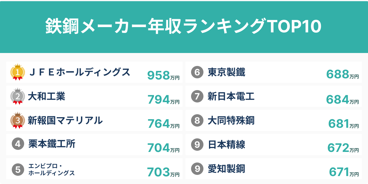 三位は新報国マテリアル、二位は大和工業、一位はあの企業グループ!鉄鋼メーカー年収ランキングTOP10/SalesNow DBレポート
